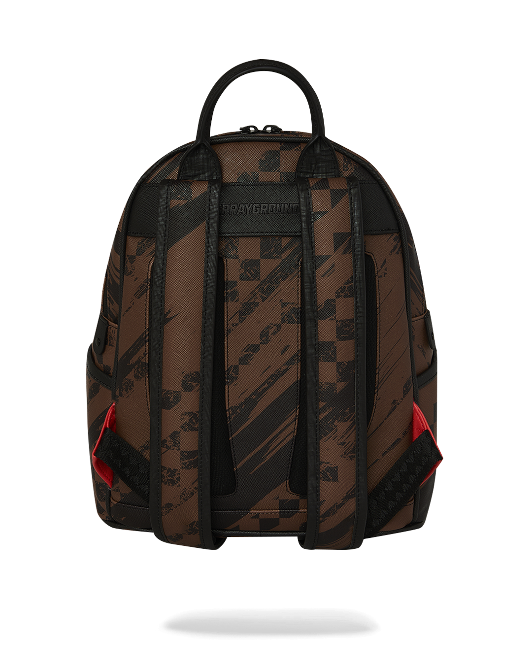 Il design presenta un mix di toni marrone cioccolato e nero con l'iconico pattern a scacchi, con pennellate nere grafiche. L'apertura rivela una fodera interna rosso vibrante.