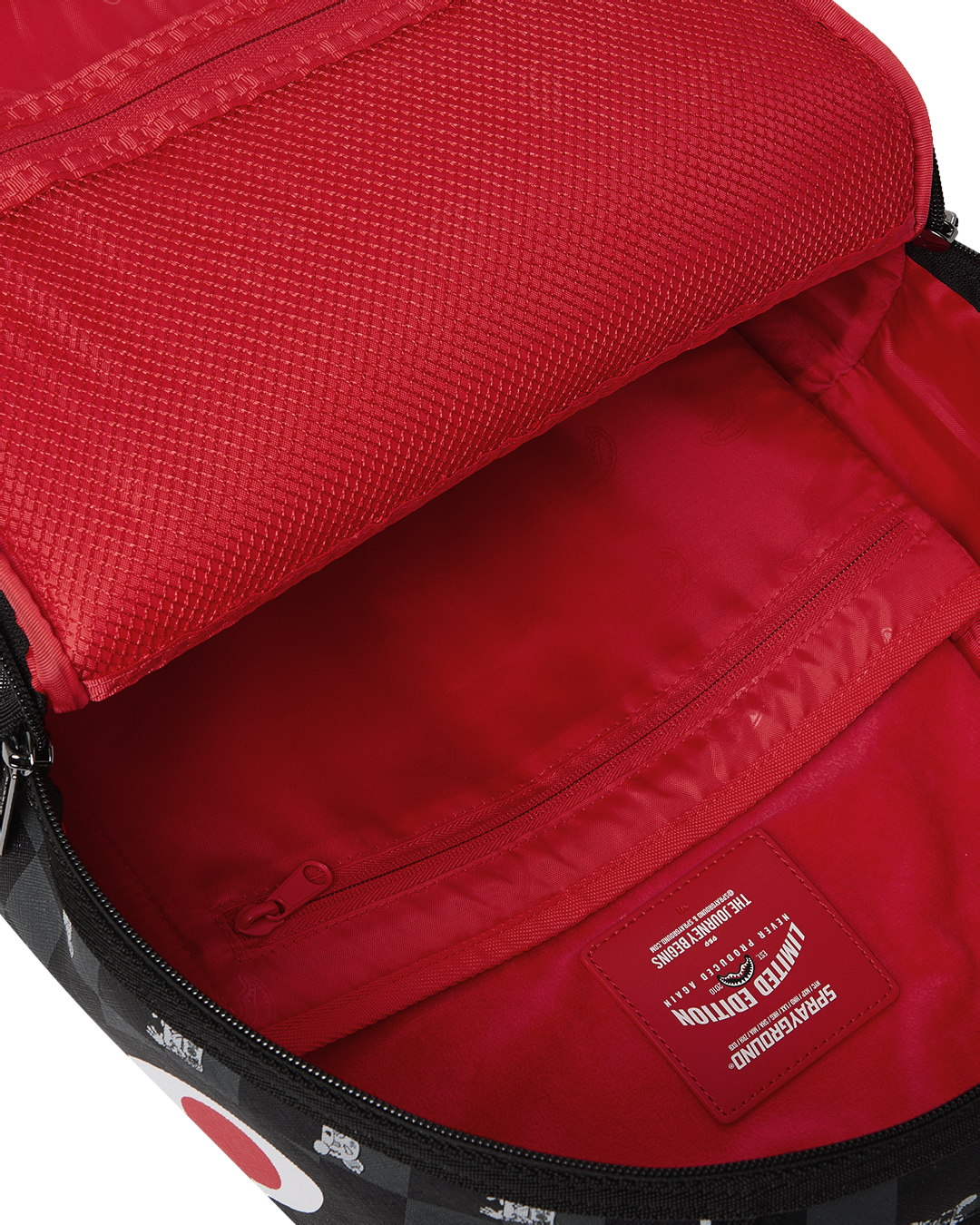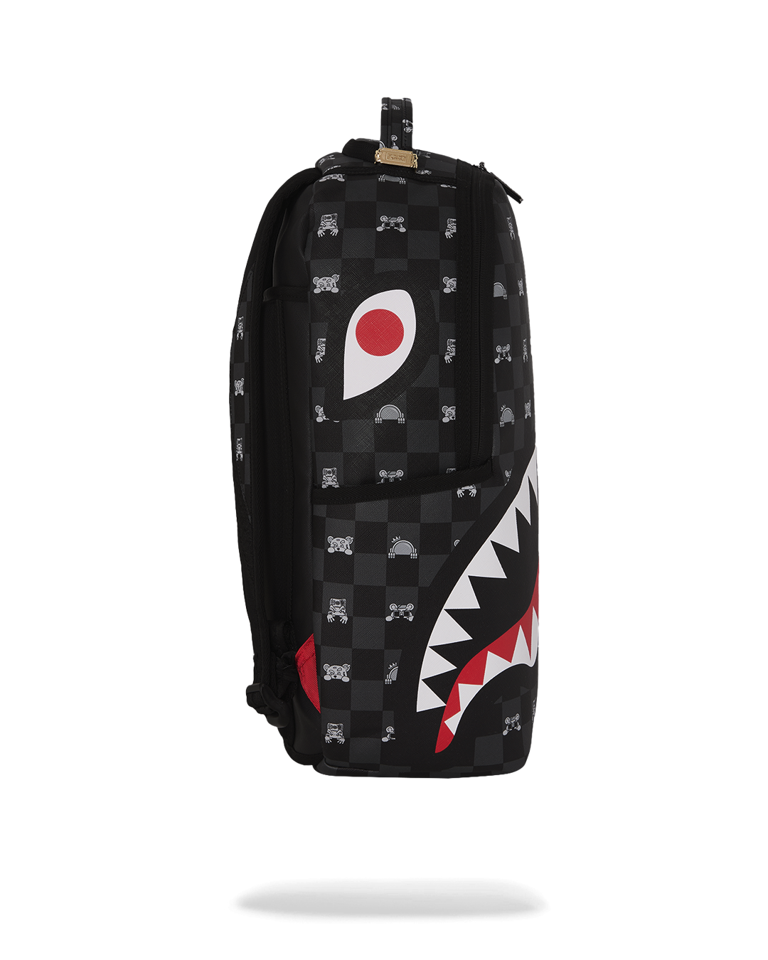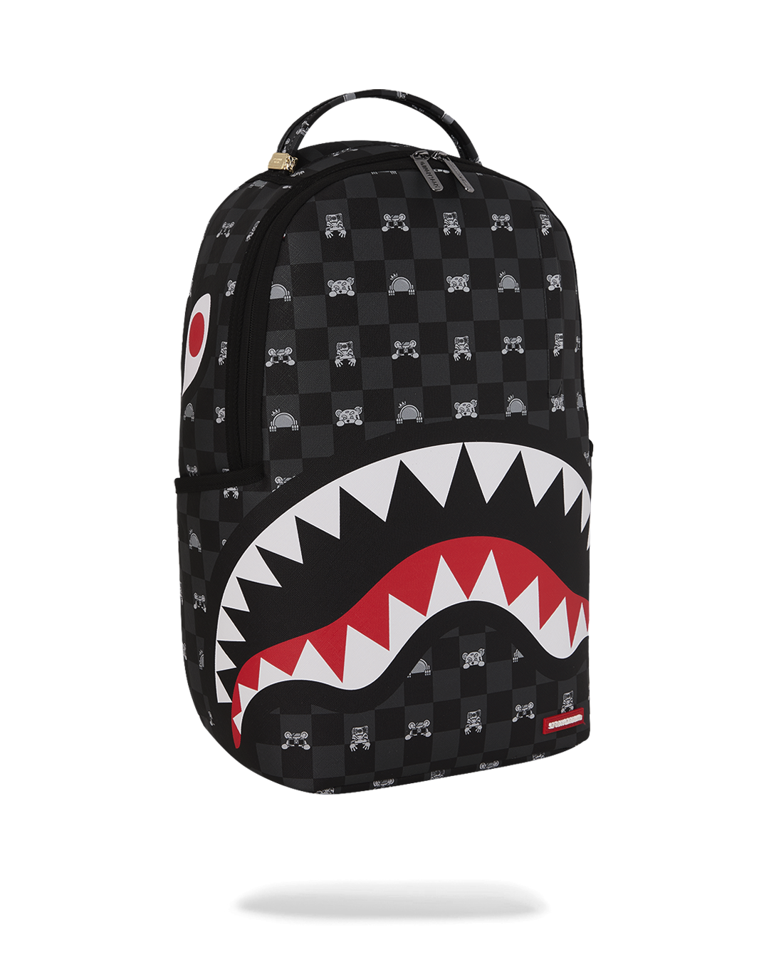La base dello zaino presenta l'iconica scacchiera Sprayground. a particolarità di questo modello è il personaggio che sbircia dall'interno dell'iconica bocca di squalo. Gli occhi del personaggio spuntano tra i denti dello squalo.