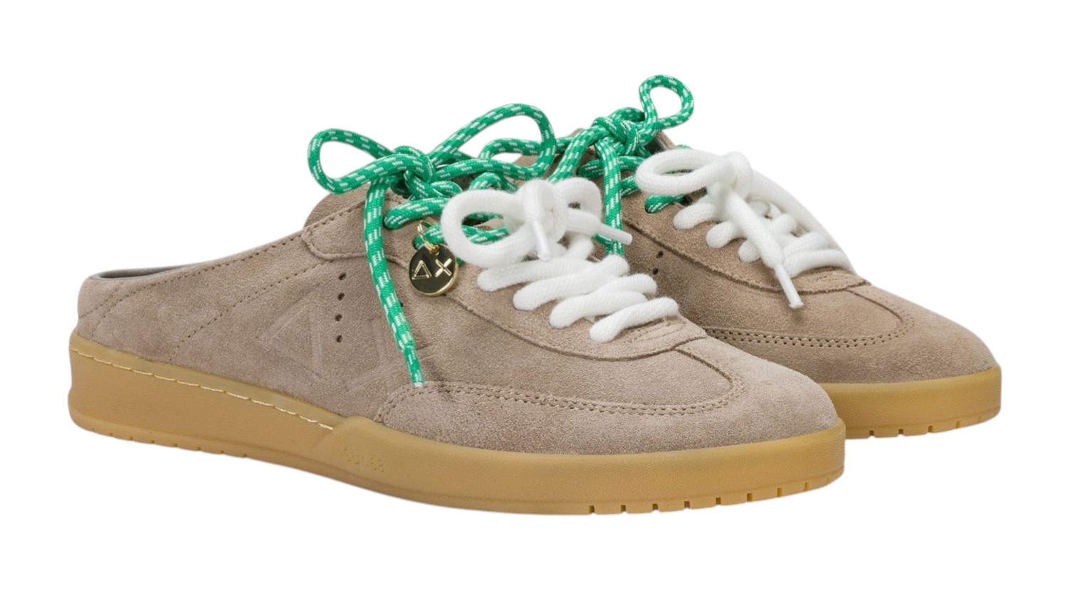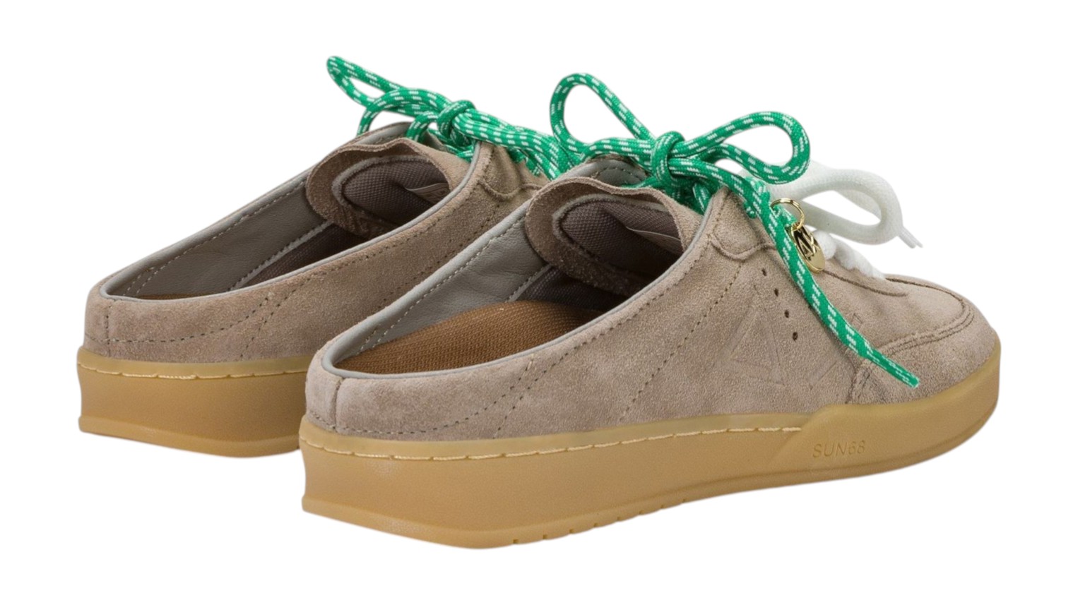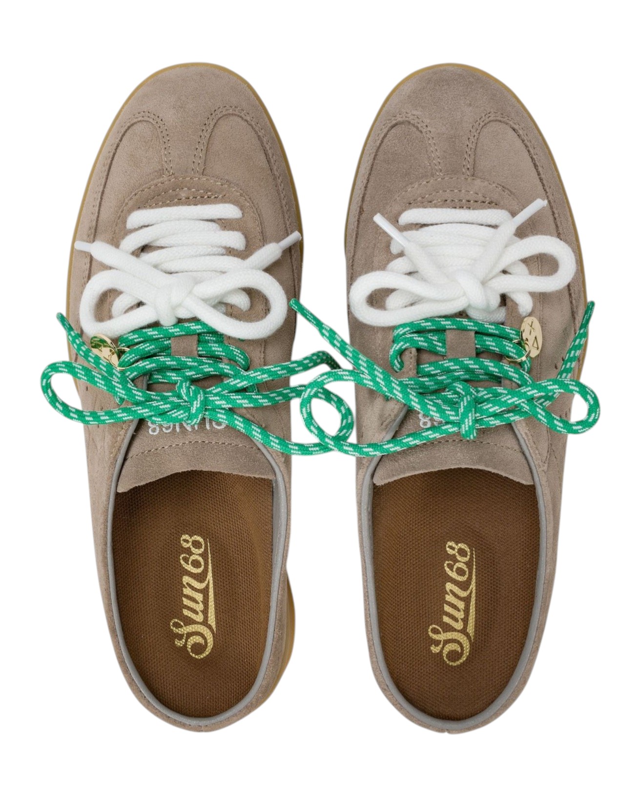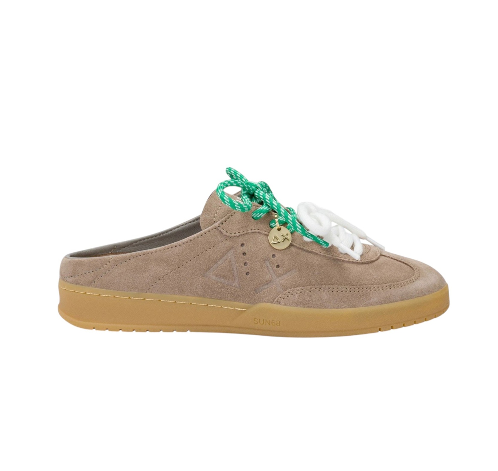 Sabot da donna in stile tennis aperta sul tallone. Realizzata in suede con charm logato in metallo, logo SUN68 impresso sul lato, chiusura con lacci a contrasto. Suola a cassetta in gomma a contrasto. Altezza suola 2 cm.