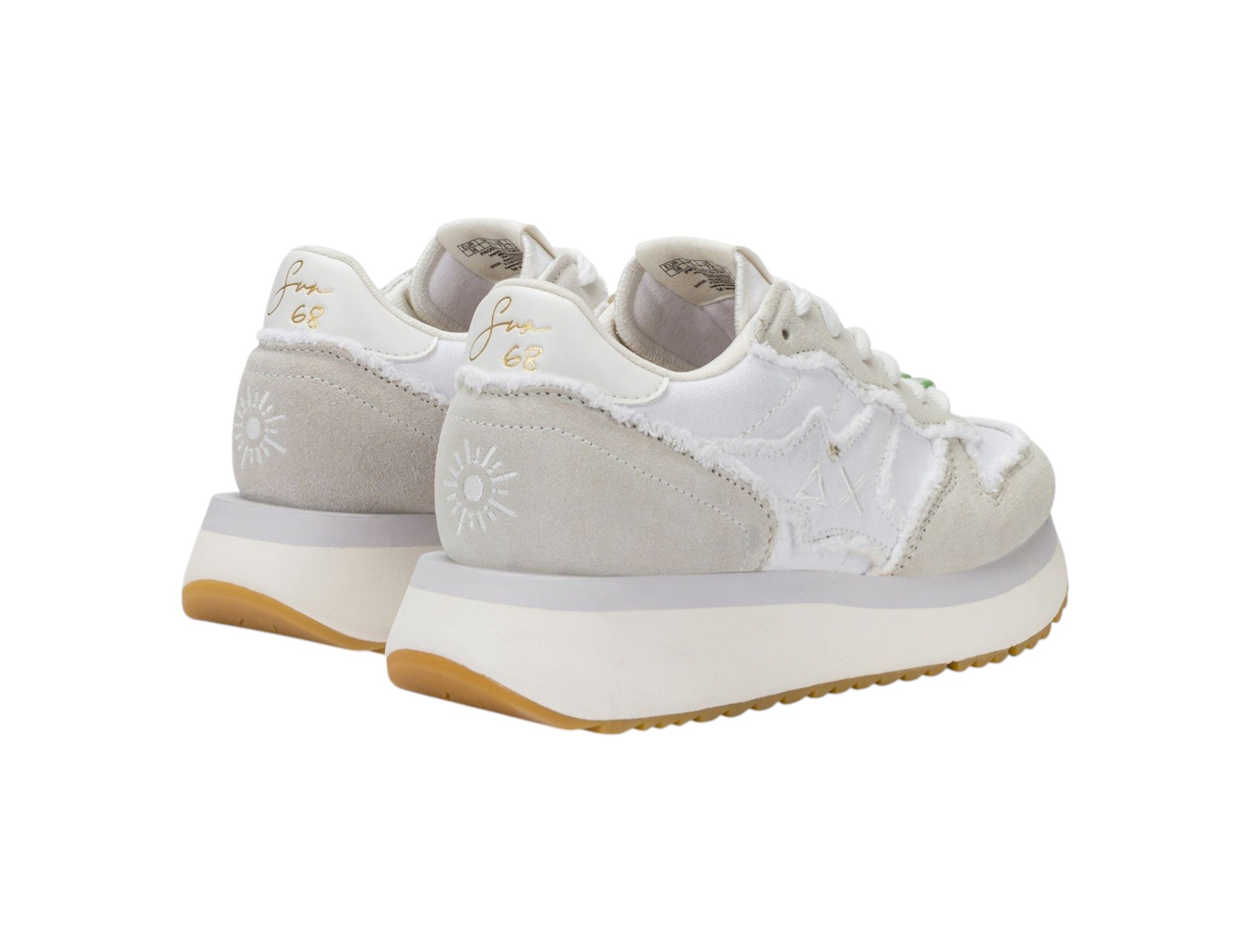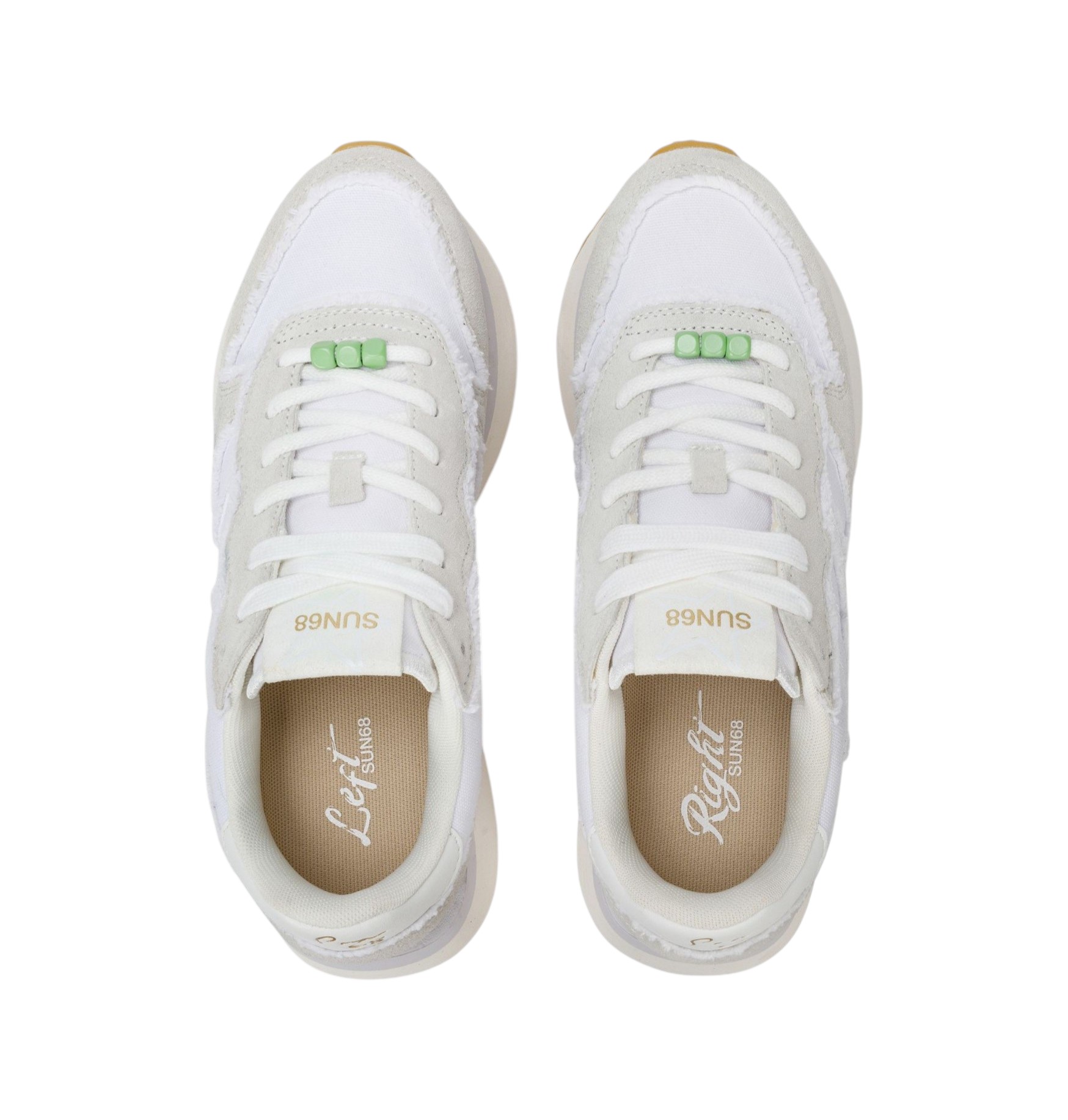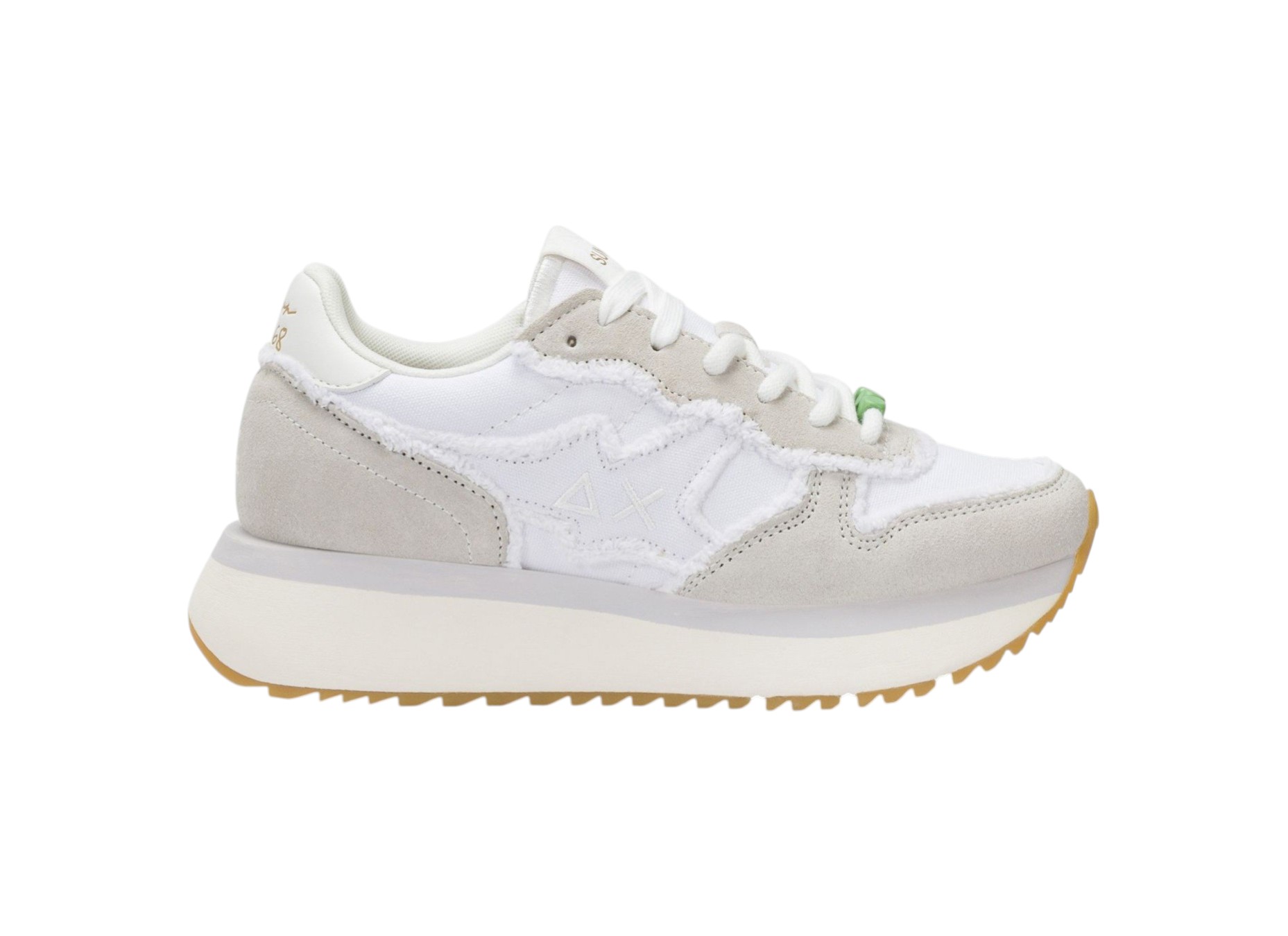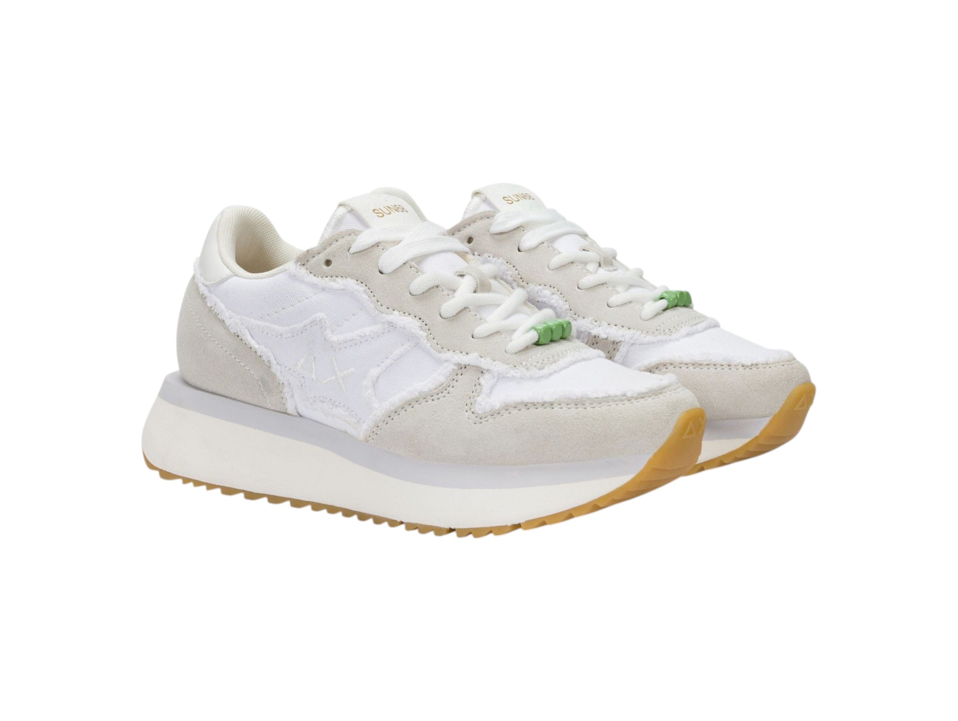 Sneakers da donna in stile running in tela e pelle scamosciata con bordi sfrangiati e perline colorate sulle stringhe. Patch con logo SUN68 ricamato, fodera in micro mesh e suola platform in EVA fresata a mano. Altezza suola di circa 4 cm.