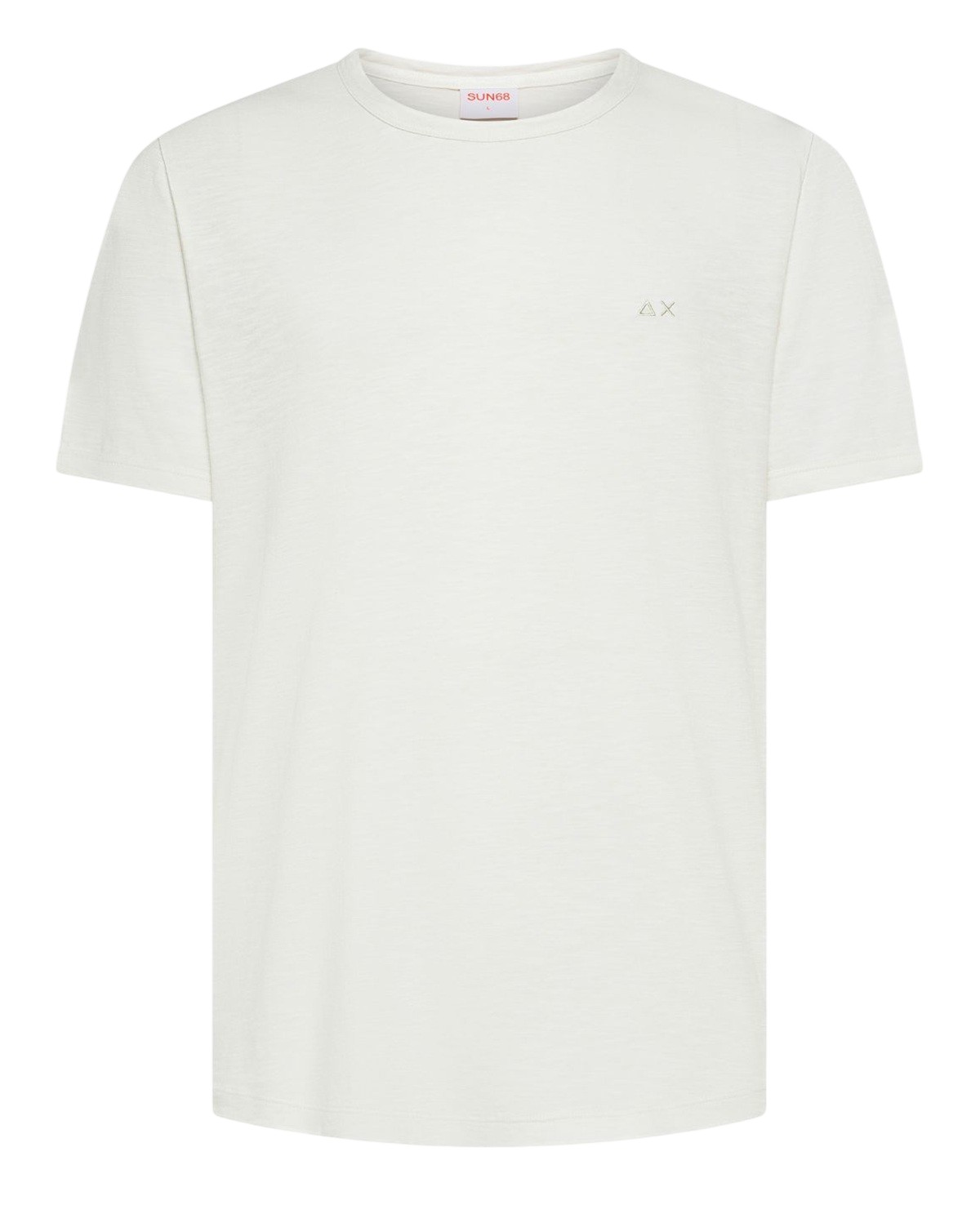 T-shirt a maniche corte in cotone fiammato. Questo tessuto si caratterizza per una trama irregolare con leggeri grumi naturali che donano al capo un aspetto materico. Logo SUN68 ricamato sul petto. Regular Fit con fondo arrotondato. Trattamento "washed" per un effetto vissuto.