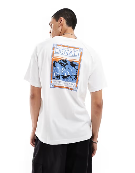 T-shirt The North Face da uomo in cotone rinnovabile, modello girocollo a manica corta. Presenta un piccolo logo stampato sul petto e un’ampia grafica multicolore dedicata al Monte Denali sul retro. Stile casual e ispirazione outdoor, ideale per il tempo libero